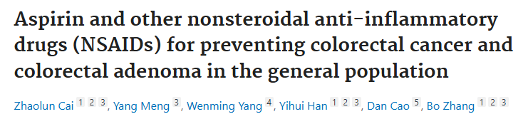 参考文献:Cai Z, Meng Y正规手机股票配资论坛, Yang W, Han Y, Cao D, Zhang B. Aspirin and other nonsteroidal anti-inflammatory drugs (NSAIDs) for preventing colorectal cancer and colorectal adenoma in the general population. Cochrane Database Syst Rev. 2026 Feb 26;2(2):CD015266. doi: 10.1002/14651858.CD015266.pub2. PMID: 41740630; PMCID: PMC12935488.